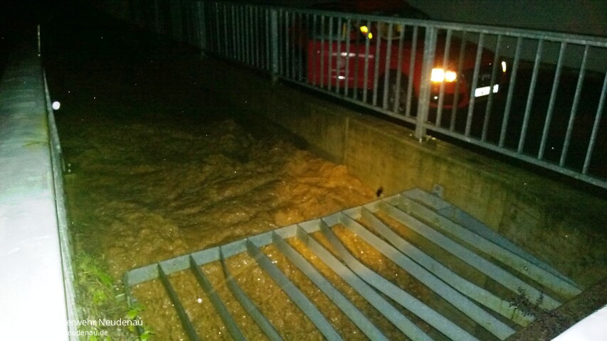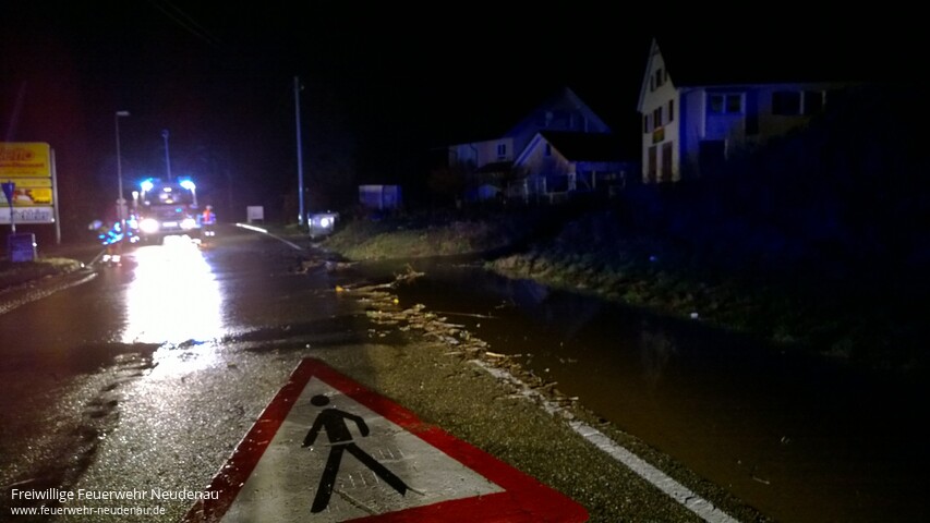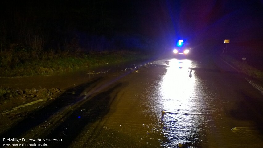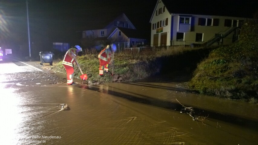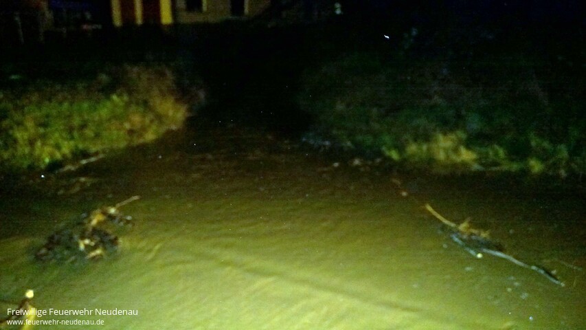 ![]() ![]() ![]() ![]() ![]() | Weil nach den heftigen Regenfällen der vergangenen Stunden drohte, dass Wasser in einen Einkaufsmarkt läuft, alarmierte der zuvor privat verständigte Feuerwehrkommandant die Einsatzabteilung (EA) Neudenau. Nach Eintreffen der Einsatzkräfte konnte dass Wasser, welches über die Straße lief, durch eigens erichtete Dämme umgeleitet und somit die Gefahr für den Einkaufmarkt, beseitigt werden. Durch den Bauhof wurde der Wasserlauf dann noch mittels Frontlader optimiert und die Landesstraße vom groben Schmutz gesäubert. Die hinzugerufene Straßenmeisterei sicherte die Gefahrenstelle mit Schildern und Blitzleuchten ab. Ein unbelehrbarer Autofahrer durchfuhr die Sperrung der Feuerwehr und gefährdete dadurch einen Kameraden. Die Polizei wurde entsprechend verständigt. In Siglingen bestand die Gefahr, dass sich das Einlaufbauwerk der Sülzverdohlung weiter zusetzt und dann die Wassermassen den Weg über die Reichertshäuser Straße nehmen. Deshalb wurde die EA Siglingen alarmiert, um die Anwohner beim Schutz ihres Hab und Gutes zu Unterstützen. Es wurde eine Barriere aus Sandsäcken gebaut und die Gefahrenstelle weiterhin kontrolliert. Nach Abschluss der primären Einsatzmaßnahmen wurde, in einer Besprechung zwischen Bauhofleiter und Feuerwehrführung, der Aufbau des weiteren Hochwasserschutzes, wenn dies notwendig sein sollte, auf den Vormittag verlegt. Die Fluttore in Siglingen und Herbolzheim wurde bereits vorsorglich geschlossen. In Herbolzheim wurden neuralgische Punkte durch den Abteilungskommandanten überprüft. Ein akuter Einsatz war dort bisher nicht erforderlich. Einsatzende war um 04.00 Uhr. | ||||||