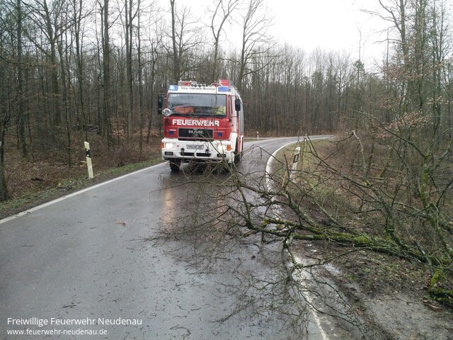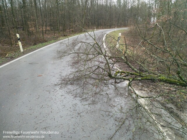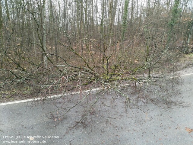 ![]() ![]() ![]() | Die Krone eines umgestürzten Baumes blockierte die Hälfte der Fahrbahn der Gemeindestraße Richtung Billigheim. Die entsprechenden Äste wurden abgesägt und von der Fahrbahn geräumt. Einsatzende 11.00 Uhr. | |