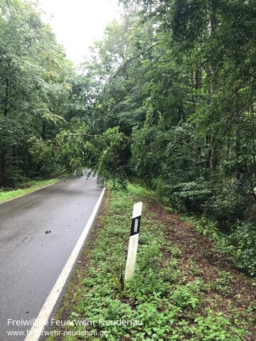 ![]() | Ein durch das am Vorabend durchziehende Unwetter umgestürzter Baum hing quer über die Gemeindeverbindungsstraße von Neudenau nach Billigheim. Das Verkehrshindernis wurde mit Motorsäge beseitigt und die Straße wieder freigegeben. | |