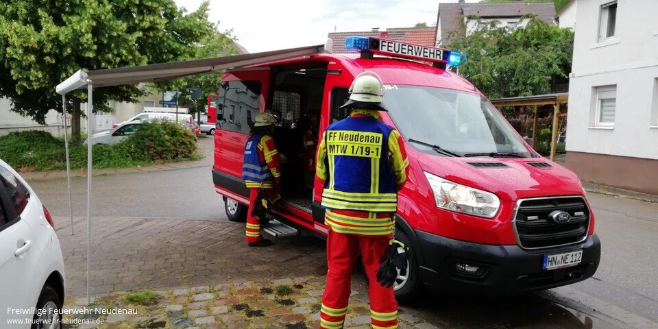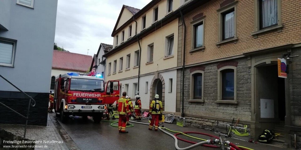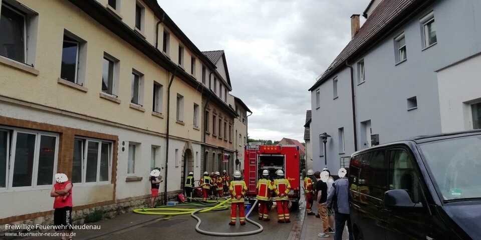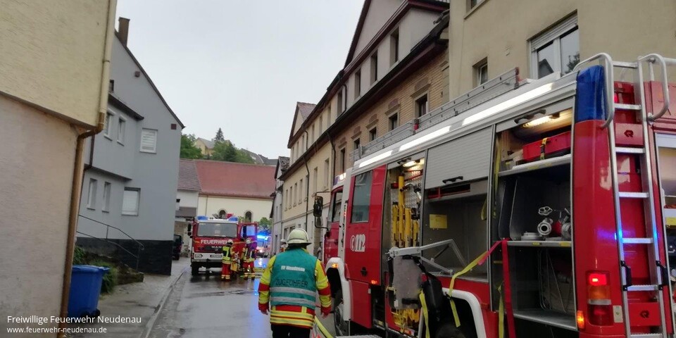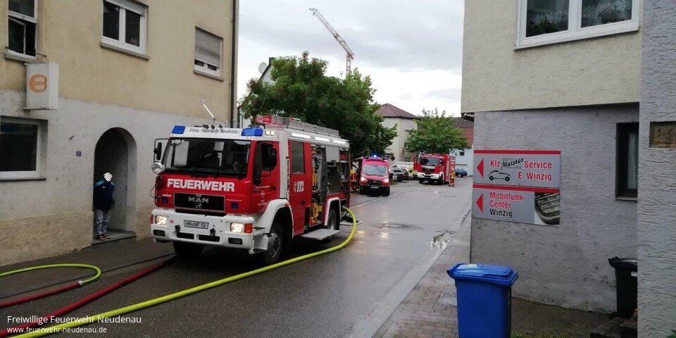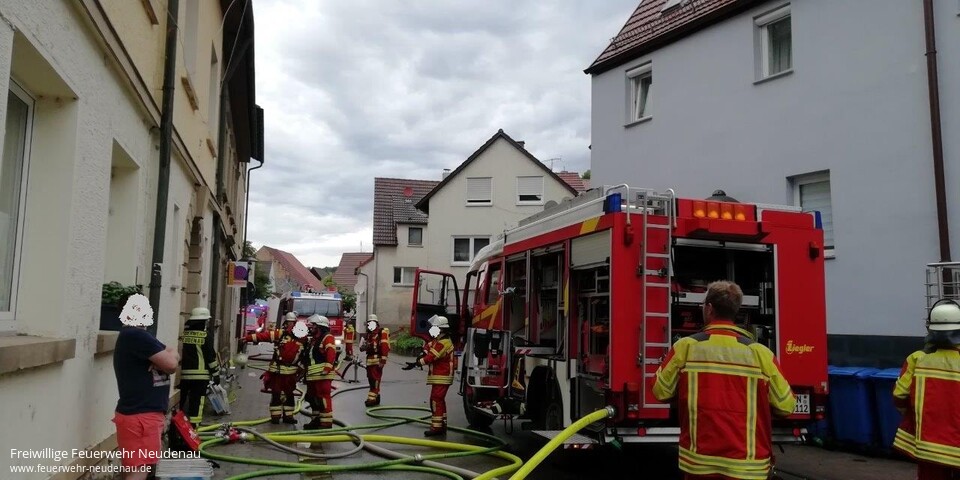 ![]() ![]() ![]() ![]() ![]() | Zu einem Zimmerbrand wurden die Einsatzabteilungen Herbolzheim und Neudenau in die Neudenauer Straße in Herbolzheim alarmiert. Die erste Erkundung ergab, eine totale Verrauchung der betroffenen Wohnung im zweiten Obergeschoss, verursacht durch einen Brand in der Küche dieser Wohnung. Zwölf der 22 Bewohner des Gebäudes befanden sich außerhalb des Gebäudes und versicherten den Kräften, dass niemand mehr im Gebäude ist. Sofort wurde mit einem C-Rohr im Innenangriff die Brandbekämpfung aufgenommen. Ein zweiter Trupp ging mit einem weiteren Rohr ins Dachgeschoss vor. Aufgrund der Gefahr, dass das Feuer auf das Dachgeschoss und das Dach übergreifen könnte, wurde die Drehleiter der Feuerwehr Möckmühl nachgefordert, die aber nicht mehr zum Einsatz kommen musste. Das Feuer konnte auf die Küche, in der es ausgebrochen war, begrenzt werden. Über der Brandstelle musste die Zimmerdecke geöffnet werden, um letzte Brandnester auszuräumen und zu löschen. Danach wurde das Gebäude druckbelüftet, um den Rauch hinauszublasen. Einsatzende war um 20.00 Uhr. | ||||||||