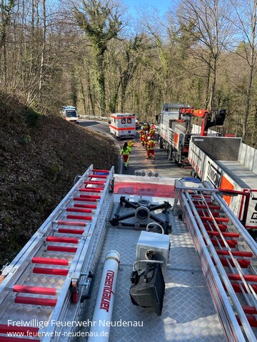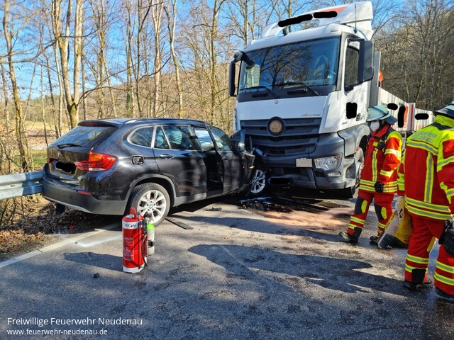 ![]() ![]() ![]() | Zu „auslaufenden Kraftstoffen nach einem Verkehrsunfall“ wurde die Einsatzabteilung Neudenau auf die L526 („Bachsträßle“) alarmiert. Kurz zuvor waren bereits die Helfer-vor-Ort gemeinsam mit dem Rettungsdienst dorthin zu einem Verkehrsunfall gerufen worden. Vor Ort mussten die Einsatzkräfte der Feuerwehr den Brandschutz sicherstellen, die Polizei bei der Verkehrssicherung unterstützen und vor allem eine große Menge Kraft- und Betriebsstoffe auffangen und aufnehmen. Die Straßenmeisterei entschied sich nach Ende des Einsatzes noch für eine „Großreinigung“ durch eine Spezialfirma. | ||||||||
