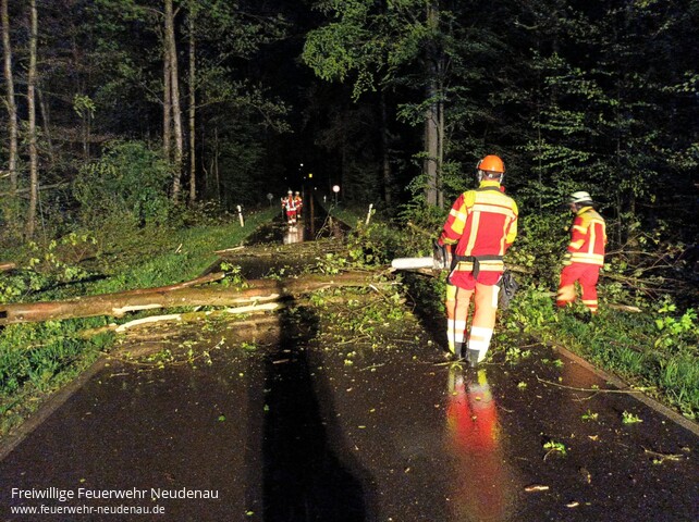 ![]() | Erneut wurde die Einsatzabteilung Neudenau zum Windbruch alarmiert. Der Einsatzort wurde fälschlicherweise mit L526 angegeben - die Einsatzstelle befand sich allerdings auf der Gemeindeverbindungsstraße zwischen Neudenau und Reichertshausen. Der quer über die Fahrbahn liegende Baum wurde zersägt, beseitigt, die Straße gereinigt und wieder freigegeben. | ||