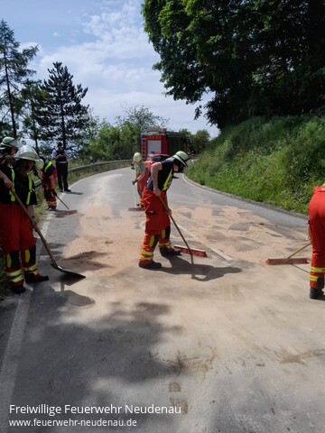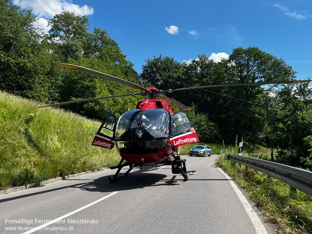 ![]() ![]() ![]() | Zum „PKW-Brand“ wurde die Einsatzabteilung Neudenau am Sonntag zur Mittagszeit alarmiert. Das Bild an der Einsatzstelle sah etwas anders aus: es hatte sich ein Verkehrsunfall mit einem Motorrad ereignet. Der Fahrer war hierbei schwer verletzt worden. Die ersteintreffenden Kräfte der Freiwilligen Feuerwehr Neudenau leisteten Erste Hilfe und stellten den Brandschutz an der Unfallstelle sicher. Zudem wurden austretende Betriebsstoffe aufgenommen und die Unfallstelle abgesichert. Hierbei wurde auch ein Landeplatz für den Rettungshubschrauber abgesichert, der den verletzten Motorradfahrer ins Krankenhaus transportierte. Die Unfallstelle wurde der Polizei und der hinzugerufenen Straßenmeisterei übergeben. Anschließend wurde die Straße noch maschinell von einem Fachunternehmen gereinigt. | |||||