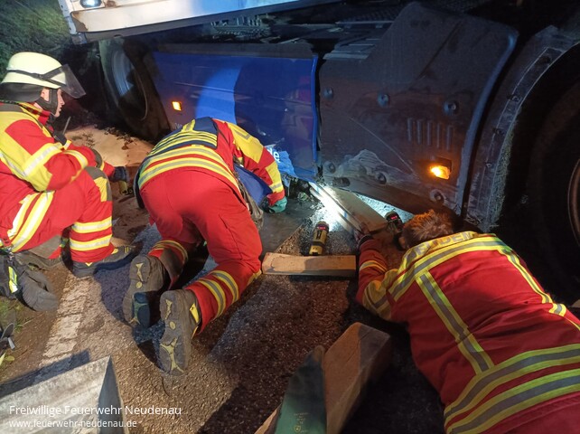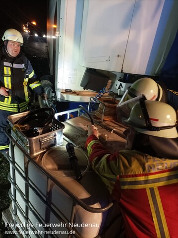 ![]() ![]() ![]() | Ein LKW eines Transportunternehmens war am Abend auf der L1096 zwischen Neudenau und Siglingen in einem Straßengraben zum Stehen gekommen. Die Bergungsarbeiten waren seit einer Weile am Laufen, als die Feuerwehr Neudenau zur Unterstützung alarmiert wurde. Zuvor war festgestellt worden, dass DIesel im Strahl aus dem Tank auslief. Die Einsatzabteilung Neudenau stellte mit dem Tanklöschfahrzeug den Brandschutz an der Einsatzstelle sicher. Die Besatzung des Gerätewagens-Logistik kümmerte sich zunächst um die Eindämmung des Schadens, indem großflächig Barrieren aus Ölbindemittel erstellt wurden und der Tank behelfsmäßig abgedichtet wurde. Die Rüstwagen aus Möckmühl wurde mit einer Gefahrstoffpumpe angefordert. Mit dieser wurden etwa 600 Liter Diesel aus dem Tank des LKW in ebenfalls zur Einsatzstelle verbrachte IBC-Container umgepumpt. Abschließend wurde die Einsatzstelle an die Straßenmeisterei, Polizei und ein Bergungs-/Reinigungsunternehmen übergeben. | |||||||