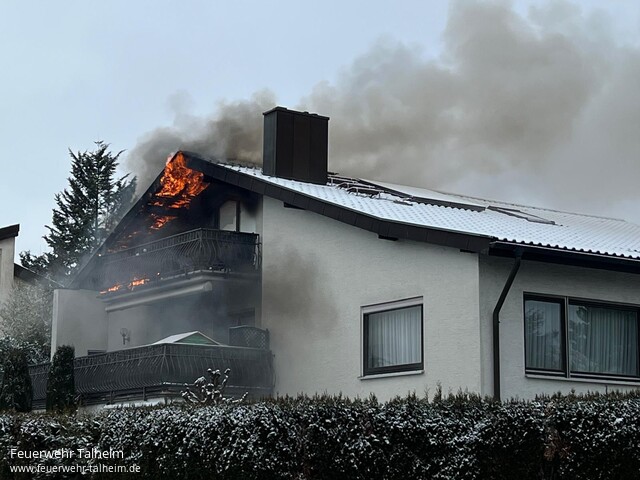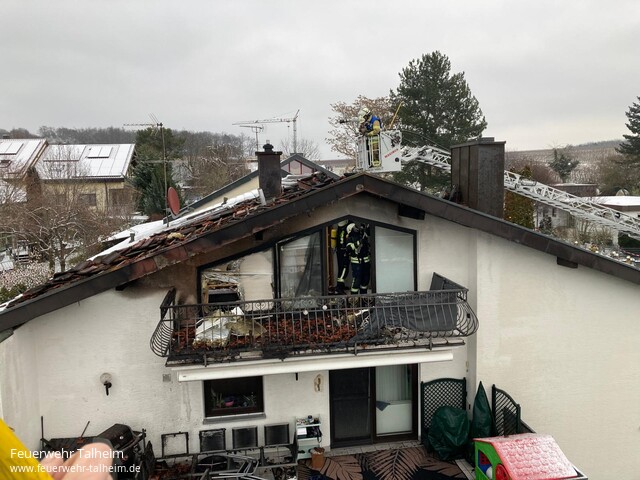 | Am 6. Januar 2026 wurde die Feuerwehr Talheim um 12:45 Uhr zu einem Dachstuhlbrand in einem Mehrfamilienhaus in der Königsberger Straße alarmiert. Beim Eintreffen der ersten Einsatzkräfte stand der Dachstuhl bereits in Flammen. Alle Bewohner hatten sich bereits selbstständig über die regulären Ausgänge ins Freie gerettet. Drei Personen erlitten leichte Rauchgasvergiftungen und wurden durch den Rettungsdienst versorgt. Das Feuer hatte auf dem Balkon im Obergeschoss begonnen und sich von dort aus in die Dachverkleidung und weiter in die Dachunterkonstruktion gefressen. Um eine rasche Brandausbreitung zu verhindern, wurde das Feuer zunächst von der Straße aus mit einem Strahlrohr bekämpft, um ein weiteres Unterwandern der Deckenverkleidung zu verhindern. Parallel dazu wurden weitere Kräfte nachalarmiert. Die Feuerwehr Lauffen führte in der Fleinerstraße über eine Drehleiter eine Dachöffnung durch und unterstützte die Löscharbeiten im Dachbereich. Die ebenfalls hinzugezogene Drehleiter aus Heilbronn deckte Teile des Daches im betroffenen Bereich von der Königsberger Straße aus ab, um gezielt Brandnester freizulegen und abzulöschen. Gemeinsam mit den Trupps im Innenangriff wurde das Dach geöffnet und alle Glutnester abgelöscht. Zudem wurde der Keller des Wohngebäudes auf eventuell herabfallende Glutstücke überprüft, die durch den Kamin gefallen sein könnten, um eine Brandgefahr hier auszuschließen. Insgesamt waren rund 120 Feuerwehrangehörige sowie Kräfte von Polizei und Rettungsdienst im Einsatz. Eine Gefahr für umliegende Gebäude bestand zu keinem Zeitpunkt. Das Gebäude wurde durch den Brand jedoch so stark beschädigt, dass es teilweise unbewohnbar blieb. Nach Abschluss der Löscharbeiten und umfangreicher Kontrollen wurde die Einsatzstelle an die Polizei übergeben. Die Brandursache war zum Zeitpunkt der Löscharbeiten unbekannt und ist weiterhin Gegenstand polizeilicher Ermittlungen. |